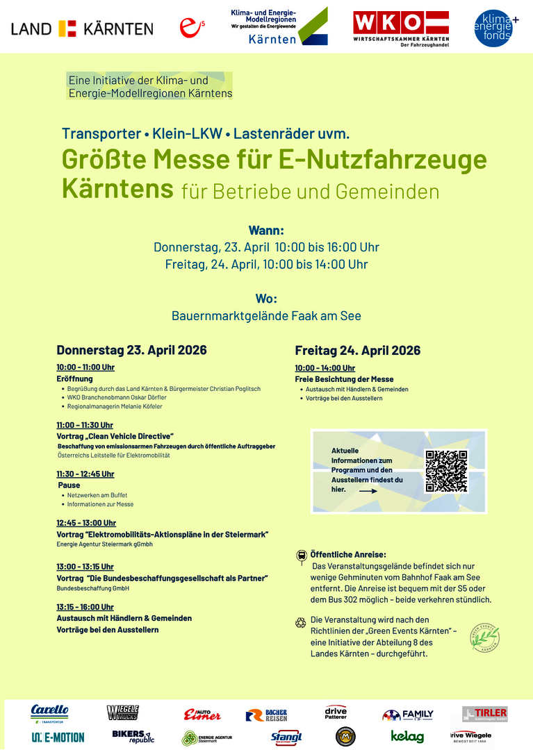 Am Donnerstag, den 23. April und Freitag, 24. April 2026 findet am Bauernmarktgelände in Faak am See von jeweils 10:00 Uhr bis 16:00 bzw. 14:00 Uhr die E-Nutzfahrzeuge-Messe für Betriebe & Gemeinden statt.